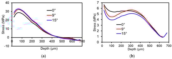 Effect of the orientation between the fiber and strain gauge on the residual stresses. The strain gauge has been applied with an offset angle of 0, 9 and 15 degrees, respectively. (a) σx and (b) σy, where the combination 1 of strain gauge grids in Figure 2b is employed. See text for details.