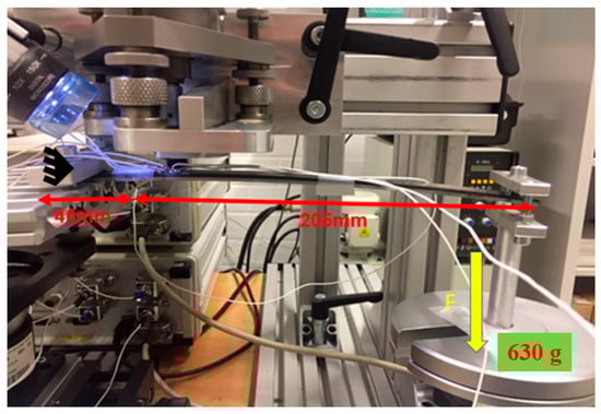 The objective of this section is to validate the residual stress measurements in hybrid components using bending tests, imposing a well-defined load distribution. This procedure was already used successfully for validating the reliability of measurements in thin metal sheets [] and in polycarbonate samples []. In both cases, very satisfying results were found. One hybrid component with the dimension given in Figure 5 is used for validation. The validation tests are carried out on both the CFRP and the steel sides. The validation test firstly considers a residual stress measurement at a single point with the distance of 40 mm from the edge of the sample (cf. Figure 12) on the CFRP side without loading. Then, one side of the sample is clamped and the other side is loaded, as shown in Figure 12. With the given loading, the stresses imposed by the overall loading situation on the whole sample can be calculated by elastic simulation employing a FEA model, assuming that CFRP and steel are perfectly bonded. Figure 13 depicts the stress distribution in the X direction. In the present work, a weight of 630 g is fixed at one side of the sample, eventually leading to an induced surface stress of about 19 MPa at the point of drilling. Upon loading, a second hole is drilled next to the previous one (the initial hole drilled without superimposed external load). Figure 14 details the experimentally determined stresses under this loading situation, which are in turn the sum of the stresses induced by loading (Figure 14b) and the initially determined process-induced residual stresses (Figure 14a). Evaluation of data in this case is based on the assumption that without superimposed external loading, the process-induced residual stresses of two adjacent points are very similar. To avoid direct influence of the first and second hole drilled, a distance of 5 mm between both was chosen. Based on these considerations, the stress induced by loading should be equal to the difference between the initial, process induced residual stress values (without induced bending load) and the total stress values (with superimposed bending load). These values can then directly compared to the calculated values obtained through FEA (see Figure 14c). Here, the solid line corresponds to the calculated value by FEA induced by bending. It can be seen that a good agreement between the residual stress difference and the numerical value is obtained. This clearly implies that the approach introduced for the determination of residual stresses in the hybrid components considered is absolutely reliable. Similarly, the procedure has been carried out for the steel side. The comparison between the residual stress difference (with loading and without loading) and the calculated stresses through FEA is shown in Figure 14d, where Sum σx indicates the sum of the stresses induced by loading and the initially determined process-induced residual stress σx. Here, a good agreement is found as well.