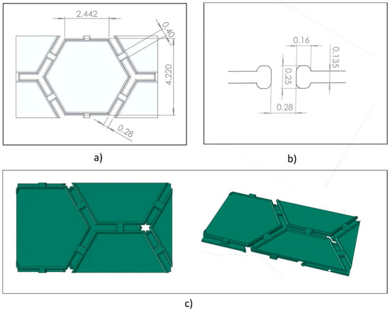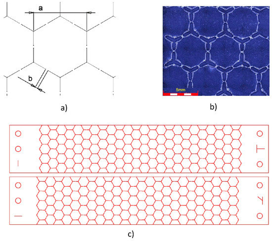 The components of this FEM are partitioned from the same part, so that no interaction conditions where necessary, and thus debonding was not possible in the model. As the materials are linear, and the goal is to calculate composite stiffness, a total strain of 1% is applied to the representative volume element shown in Figure 2c. The measured hexagonal width was 4.22 mm, the side length was 2.442 mm, the cut gap was 280 µm, and the bridge width was 0.4 mm, shown in Figure 2a. Figure 2b shows the increase in the thickness of the polystyrene sheets due to the laser energy melting the polymer along the cut line. The increase in width that we refer to as a bulge has a total thickness of 250 µm and a width of 160 µm. The bulge is added to the CAD model of the RVE to represent the reinforcement tablets more accurately. Due to the bulge and limited pressure used when laminating the layers, the matrix layer thickness remained relatively large, with a value of 168 µm.