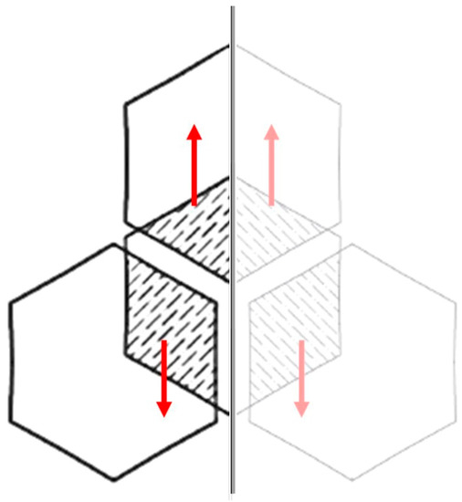 The hexagonal tablet overlap has symmetry, as shown in Figure 3, which can be used to calculate the required variables. If the gaps between hexagons are neglected, we should obtain a stiffer model. Due to a non-rectangular geometry, half a hexagon with an edge length “a” of 2.44 mm, and a half area of 7.72 mm2 with a half-width of 2.115 mm, can be approximated to a rectangle of 3.656 mm length. Thus, an area overlap of 0.29% would be equivalent to an overlap length of 1.0627 mm. The volume fraction ϕ would be 0.4455 and the aspect ratio of the overlap region would be 7.87. The resultant shear transfer number would be β0 = 1.527. The calculated stiffness with the simplified model is 0.845 GPa, which is considerably lower than the value calculated by the Lusis model [29].