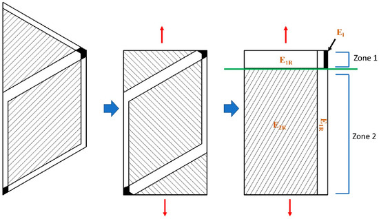 Along the load axis, the stiffness of Zone 1 is calculated following the Voigt model, with a dependence on width similar to the work of Jäger and Fratzl [35], resulting in hybrid zone stiffness . The stiffness of Zone 2 is calculated similarly, resulting in hybrid zone stiffness . To calculate resultant composite stiffness of Zone 1 and Zone 2, the equation for zones acting in series is used, as suggested by Barthelat [30].