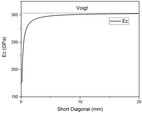 As polystyrene is not the right candidate for high strength composites and is only used for experimental validation of the model, a carbon film with epoxy matrix composite has its stiffness predicted using the hexagonal model using the carbon films described earlier with a stiffness of 600 GPa and a thickness of 50 µm [36] and epoxy resins matrix of stiffness 3 GPa [37], assuming that interface thickness is equal to reinforcing layer thickness and the cut width is 35 µm, based on the laser cut notches using YAG solid-state laser as described by Lodes et al. [36]. The determined values can then be used to plot the change in composite stiffness depending on the size of the hexagonal tablet shown in Figure 6.