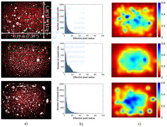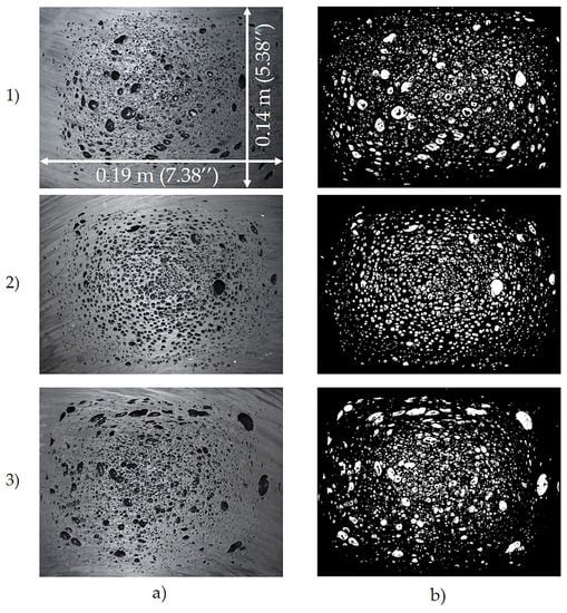 The photographed samples were imported into the MATLAB environment as an array representing the image color density as a function of pixel location. The uploaded images taken from three different cross-sections are shown in Figure 2a. Pixels were converted from a grayscale value to a binary value using color contrast differentiation. It was found that a yellow tint using the automatic enhance option included in the Windows photo editor provided reasonable pre-processing contrast variations in differentiating the solid region from the darker cells. A threshold value of 25% was selected for the images, and the noise within the binary image was removed using a morphological structure operation by ignoring individual false single pixels. As shown in Figure 2b, the white pixels denote cells, and the neighboring solid surface region is denoted in black.