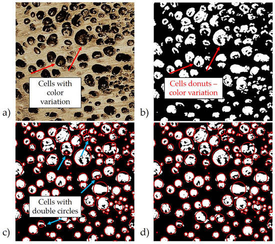 This method then considers the effective area of the cells shown in white pixels and draws a circle around it. The dimensions of this circle are defined as the effective diameter using the automated MATLAB subroutine which is much faster compared to highly sophisticated and manual use of an optical microscope. During image processing, false positives must be identified and properly addressed. As seen in Figure 3a,b, it can be noted that in the picture taken with the COTS camera, there are color contrast variations within the cell cavity itself. The first false positive, termed a donut, is a cell region that contains black pixels resembling a solid shell. For the overall sample size of 7.38 × 5.38 inches, the image is approximately 3000 × 2300 pixels, and the size of each pixel is 63.5 m. For the composite structure discussed, the radius of the fibers was measured to be 8.56 m ± 0.57 m [39] and thus the fibers are not visible within the image. Optical microscopy was performed on the surface of the cells, and the fibers did not protrude from the cell wall. A second false positive, termed a double circle, is a shell region that appears to cover a portion of the cell due to flaws introduced from the saw blade used in the sectioning process.