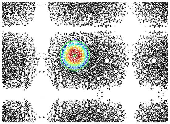 The cells identified within the circle were averaged to calculate the local density using an exponential decaying weight function. This allowed the areas of the cells closest to the grid point to have the highest contribution to the effective density, whereas the cells farther from the center have less of a contribution to the effective density. This is also denoted by the color variations, as seen in Figure 5. The cells closest to the center are colored red and provide the highest contribution to the density homogenization, whereas the cells farthest from the center are shown in colors that transition to yellow and then to blue as their contribution decreases. The exponential decay function is defined as,