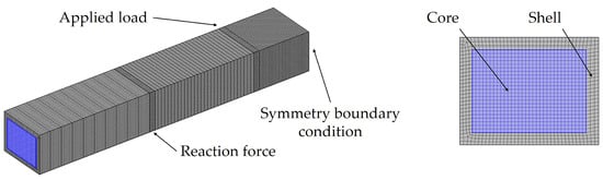 To make use of the available computing power and reduce the computation time, symmetry was used to model the four-point bend test. A quadrilateral mesh was used to model this geometry and is shown in Figure 6. This model was then run with 3.5 million degrees of freedom, and the presented results were compared to results obtained at 8 million degrees of freedom, which was the threshold of the computational resources available on the workstation utilized for the study, an Intel i9-7940X CPU at 3.10 GHz, 14 cores, 28 logical processors, and 64 GB memory. The presented results are graphically indistinguishable from those from the higher resolution model.