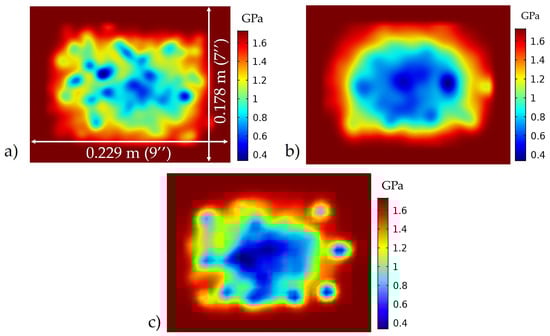 The pointwise Young’s modulus was calculated from the spatially varying density using Equation (9) using the data shown in Figure 7c. This spatially varying modulus was then read into COMSOL as discussed in Section 2.4 and the results are presented in Figure 8 for each of the three samples. The Young’s modulus was predicted for the shell region as = 1.73 GPa [39], where, is the Young’s modulus of the HDPE, GFPP composite, and is used for the solid outer shell. Figure 7c and Figure 8 are similar in spatial distribution as the localized density relates to the localized stiffness from Equation (9).