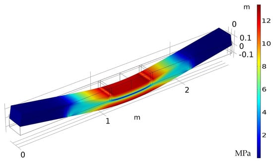 In a previous work [39], the aforementioned micromechanical modeling on coupon samples was experimentally validated for the shell and the core region. The earlier work was extended to include a full non-linear finite element solution, with inputs of the constitutive properties of the neat polymers and fibers. The previous modeling work was extended in the present study to allow for spatial variations of the foam density as indicated in Figure 2 using the image processing technique discussed in the previous sections. The Young’s modulus grid developed using Equation (9) was exported into the finite element software package COMSOL (Version 5.4, COMSOL Inc., Burlington, MA, USA) using a custom subroutine written in MATLAB that takes the spatial location as inputs and returns the effective local anisotropic stiffness tensor. The finite element domain is that of a 0.178 m × 0.229 m (7 in × 9 in) tie that is 2.62 m (8.6 ft) in length as shown in Table 2, which is placed in a four-point bend testing configuration conforming to the ASTM D6109-13 dimensions.