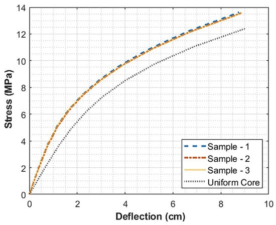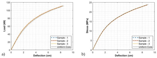 To compare the load-deflection of the four models, the results from samples 1, 2, and 3 were compared to a model that one would obtain if the core had a uniform distribution. The results are shown in Figure 10a and it is observed that all four scenarios yield equivalent results for the overall load-deflection behavior. Equation (12) is used to convert the load to stress and displacement to strain, and the results are shown in Figure 10b.