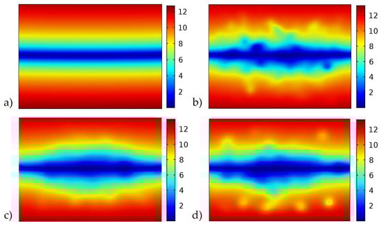 The real benefit of the spatially varying cell density homogenization approach allows one to look carefully at the point-wise stress distribution within the core region. Notice in Figure 11a that for the uniform core with no spatial variation, the internal von-Mises stress varies linearly in y with a zero-stress state at the geometric centroid. This behavior changes quickly for the three samples, with spatial variations in the cell density as shown in Figure 11b–d.