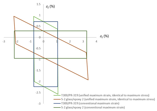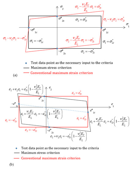 In fact, if one accepts the argument and formulation above, he/she can then find that conditions (17)–(19) reproduce those in (1)–(3) identically under the condition of linear elasticity. The derivation will be provided in Appendix A. This unifies the maximum strain criterion with the maximum stress criterion. The parallelogram in Figure 2 is identical to the failure envelope from the maximum stress criterion, but plotted in the strain plane. The considerations underlying the unification are the facts that the failure strains for direct strains are obtained under uniaxial stress states, and that sideways strains due to the Poisson effect do not contribute to the failure in these directions. These considerations happen to be implied within the framework of the maximum stress criterion.