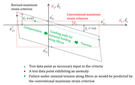 The above argument applies in a straightforward manner if a plane stress condition is considered. The same plane stress problem for S2-glass/epoxy as cited above can be employed to illustrate the disparity between the conventional criterion and its revised form, as formulated above and also shown in Figure 2, where the conventional criterion gives the failure envelope as a rectangle sketched in red dashed lines (not to scale), whilst the newly formulated one is shown as a parallelogram in black solid lines. The latter reminds one of the appearance of the failure envelope from the maximum stress criterion, but expressed in terms of strains on the same plane, as plotted in Figure 1b.