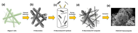 As shown in the scheme in Figure 1a,b, Magnus’s salt needle templates were prepared by adding salt solutions with oppositely charged square planar platinum ions, and then chemically reduced with NaBH4 to form the Pt macrotubes with a square cross section [36]. After rinsing and drying, the platinum macrotubes were then combined with carbon nanotubes to form a composite as shown in Figure 1c. To break the macrotubes apart and to disperse the Pt nanoparticles comprised within, the composite inks were sonicated for 45 min each and stored at room temperature to achieve the final Pt/CNT nanocomposite ink (Figure 1d,e).