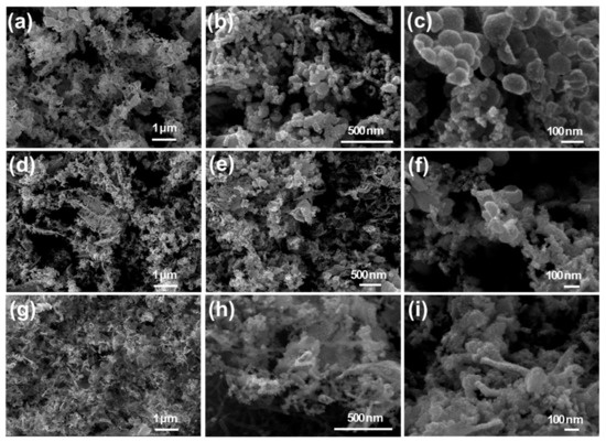 Scanning electron microscope images of (a–c) 25 mM Pt with 10 wt % CNTs, (d–f) 25 mM Pt with 20 wt % CNTs, and (g–i) 100 mM Pt with 20 wt % CNTs.