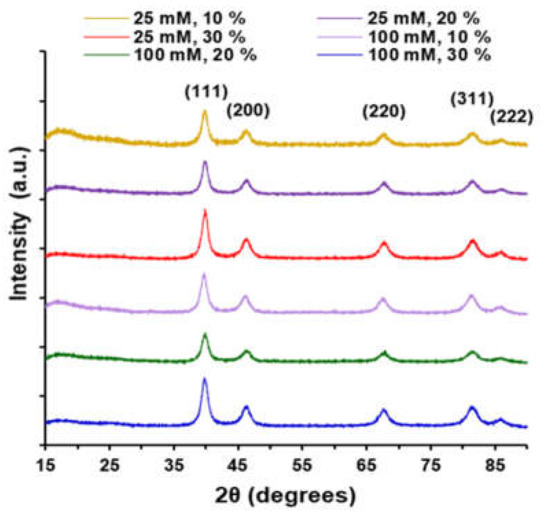 X-ray diffractometry (XRD) spectra were collected using a Malvern Panalytical Empyrean diffractometer (Malvern Panalytical, Almelo, Netherlands) using Cu Kα radiation (1.54060 Å), 45 kV and 40 mA, with a diffraction angle (2θ) range from 5° to 90°. Step size was 0.0130 at 20 s per step. XRD spectra analysis was performed using High Score Plus software (Panalytical). Crystallite size (D) was calculated using the Debye–Scherrer formula, D = Kλ/(Bcosθ), where a shape factor of K = 0.9 was used. The remaining variables are full width at half maxima (B), radiation wave length (λ), and Bragg angle (θ).