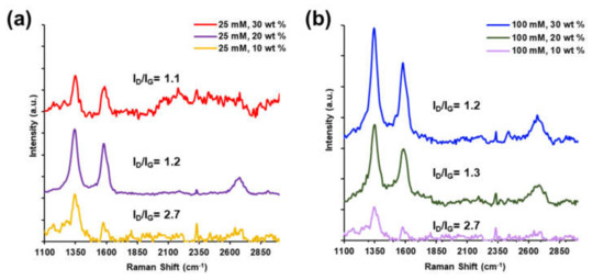 Raman spectra in Figure 4 for the 25 mM and 100 mM PtNP/CNT nanocomposites show the typical spectrum of multi-walled CNTs with characteristic doublet peaks of the D-band and G-band at approximately 1330 cm−1 and 1550 cm−1, respectively. The D-band is a result of vibrations of sp3 bonded carbon atoms and dangling bonds, the G-band originates from the sp2 bonded carbon atoms within the structure of the CNTs, and the third prominent 2D-band arises from the second order electron-phonon intensity. The relative height of each peak determines the level of disorder within the graphitic CNT structure [52,53,54]. As shown in Figure 4a,b, the Raman spectra of the PtNP/CNT composites show the D (1347 to 1352 cm−1), G (1578 to 1586 cm−1), and 2D (2679 to 2697 cm−1) bands, respectively. The ID/IG ratio for 25 mM and 100 mM PtNP/CNT composites decreased with increasing the amount of CNTs in the PtNP/CNT nanocomposite due to the increase in the degree of graphitization from the presence of a larger amount of CNTs with respect to the amount of platinum nanoparticles to interact and introduce structural defects along the CNT structure [52,53]. Figure 4a depicts the Raman spectrum with the ID/IG ratios of 25 mM/20 wt % and 25 mM/30 wt % PtNP/CNT nanocomposites to be 1.2 and 1.1, respectively, whereas it is 2.7 for the 25 mM/10 wt %. Moreover, Figure 4b shows the Raman spectrum with the ID/IG ratios of the 100 mM Pt/CNT nanocomposites at 10 wt %, 20 wt %, and 30 wt % were 2.7, 1.3, and 1.2, respectively. The ID/IG ratio of both the 25 mM and 100 mM PtNP/CNT nanocomposites with higher wt % CNTs is closer in magnitude to that of the ID/IG ratio of pristine CNTs of 1.45 (Figure S5). Both of the PtNP/CNT nanocomposites from 25 mM and 100 mM with 10 wt % CNTs have the highest ID/IG ratio of 2.7. This is an indication of the presence of a more fused nanocomposite structure with Pt nanoparticles directly interacting with sp2 hybridized structure of the CNTs interfering with the innate graphitic structure of CNTs as evidenced from the change of ID/IG ratio (1.45) of pristine CNTs (Figure S5) [54]. The noise in the 25 and 100 mM spectra towards higher than 1900 cm−1 Raman shift is attributed to defects in the electronic and vibrational structure related to disorder of the local nanotube lattice [55].