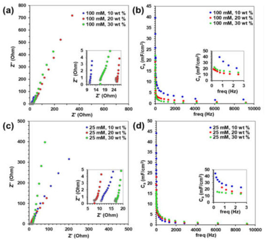 where f is the frequency, Z” is the imaginary component of impedance, and A is the geometric area of the PtNP/CNT on the GC electrode [60,61]. Areal capacitance as a function of frequency for the 25 mM PtNP/CNT composite ink is plotted in Figure 5b and for the 100 mM PtNP/CNT composite ink in Figure 5d. At low frequencies, the Ca of the 25 mM PtNP/CNT composite ink was inversely proportional to the amount of CNTs. As shown in the inset of Figure 5d, at 0.7 Hz, the Ca of 25 mM PtNP/CNT composite inks was 29 mF/cm2 with 10 wt % CNTs, 23 mF/cm2 with 20 wt % CNTs, and 15 mF/cm2 with 30 wt% CNTs. The Ca for 100 mM PtNP and 10 wt % CNT composite ink was the largest at 39 mF/cm2 but increasing the wt % of CNTs to combine with 100 mM PtNP lowered the Ca of the composite inks (Figure 5d). Moreover, increasing the mass of CNTs can lead to a loss of an open networks from the presence of more entanglements in CNTs effecting the overall surface area available for electrolyte transport through the composite ink thus lowering the capacitance.