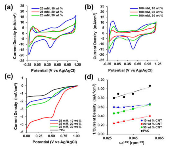 Electrochemical Characterization and Performance. Cyclic Voltammetry of PtNP/CNT nanocomposite inks in 0.5 M H2SO4 from −0.2 V to 1.2 V (vs. Ag/AgCl) at 25 mV/s for (a) 25 mM Pt and (b) 100 mM Pt with increasing wt% CNTs. (c) Linear Sweep Voltammetry of inks of 25 mM Pt with increasing wt% of CNTs compared to Pt/C in 0.5 M H2SO4 from 0 V to 1.2 V (vs. Ag/AgCl) at 10 mV/s and 1100 rpm and (d) Koutecky-Levich Plot of 25 mM Pt with increasing wt% CNTs and Pt/C at 0.35 V (vs Ag/AgCl).