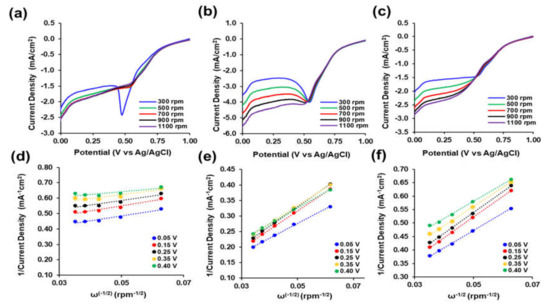 Figure 7a–c shows the LSV of the 25 mM PtNP/CNT at 10 mV/s in O2 saturated 0.5 M H2SO4 electrolyte from +1.0 V to 0 V (vs Ag/AgCl) at 300, 500, 700 rpm, 900, and 1100 rpm. The LSV for all three 25 mM PtNP with increasing wt % of CNTs shows a steady increase followed by a rapid linear increase in reduction current density until achieving the limiting current density region plateau. Figure 7a depicts the gradual steady increase in reduction current density from +1.0 V (vs Ag/AgCl) until +0.73 V (vs Ag/AgCl) before a rapid steep linear increase until +0.55 V (vs Ag/AgCl) where it reaches another steady gradual increase until +0.08 V (vs Ag/AgCl) followed by a sharper increase to 0 V (vs Ag/AgCl). In addition, the LSV for 25 mM PtNP with 20 wt % CNTs in Figure 7b, shows a similar slow increase in reduction current density until +0.78 V (vs Ag/AgCl) before a sharp linear increase until +0.6 V (vs Ag/AgCl) before an even more rapid increase to approximately +0.54 V (vs Ag/AgCl) followed by a decrease in reduction current density occurs until +0.4 V (vs Ag/AgCl) to ultimately achieving the limiting current density plateau region to +0.07 V (vs Ag/AgCl) where there is a rapid increase in reduction current density until 0 V (vs Ag/AgCl). Furthermore, the LSV of the 25 mM PtNP/CNT with 30 wt % CNTs shown in Figure 7c shows the same slow gradual increase in reduction current density until +0.76 V (vs Ag/AgCl) followed by a sharp linear increase in reduction current density to +0.51 V (vs Ag/AgCl) to reach the limiting current density plateau region until, finally, there is a sharp increase in reduction current density +0.08 V (vs Ag/AgCl) to 0 V (Ag/AgCl). This LSV performance indicates the ability of the 25 mM PtNP/CNT as a catalyst for ORR through a multiple electron transfer reaction. The difference in onset potential between all the nanocomposite inks is due to the catalytic ability for ORR. The onset potentials of the nanocomposite inks are +0.805 V (vs Ag/AgCl), +0.825 V (vs Ag/AgCl), and +0.819 V (vs Ag/AgCl) for the 10 wt %, 20 wt %, and 30 wt %, respectively. This difference in the onset potentials is attributed to the morphology and dispersion of the Pt nanoparticles through the CNT network. The inks with the lower percent of CNTs reached the limiting current density plateau region phase more quickly and exhibited more prominent reduction peaks. This is due to reaction rate and accessibility of hydrogen adsorption sites on the surface of the Pt electrode consistent with the results of the CV.