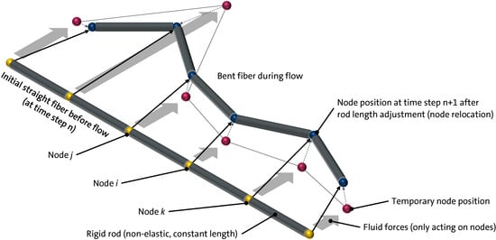 A commercially available compression molding simulation tool with a similar DFS approach is 3D TIMON CompositePRESS (Toray Engineering D Solutions Co., Ltd., Ōtsu, Shiga, Japan) [105]. Here, each fiber within the initial fiber cluster is modeled using a flexible, non-elastic chain of rods (rigid bodies, constant rod length) connected by hinge nodes [2], as shown in Figure 1. The velocity-based DFS tool begins with the filling simulation determining the flow field, assuming homogeneous isotropic resin properties (isotropic viscosity) and using a one-way coupling from the fluid flow to the fibers. Subsequently, it calculates the motion of each single fiber based on the flow velocities [2,45]. The position and curvature of each single fiber are changed according to the strain rate distribution along the fiber length [74]. Thereby, the nodes function as universal joints allowing the rods to rotate in three independent axes and thus enabling the calculation of movement, bending, and rotation of each single long fiber [2,106]. In this velocity-based direct fiber simulation approach the fiber node position is a function of the enclosing fluid velocity at every time step [2]. The melt velocity is interpolated from the node positions in the velocity field [2]. Since the motion of node directly follows the surrounding melt flow velocity, the temporary new node position for the next time step can be calculated by Equation (2) [45,107]: