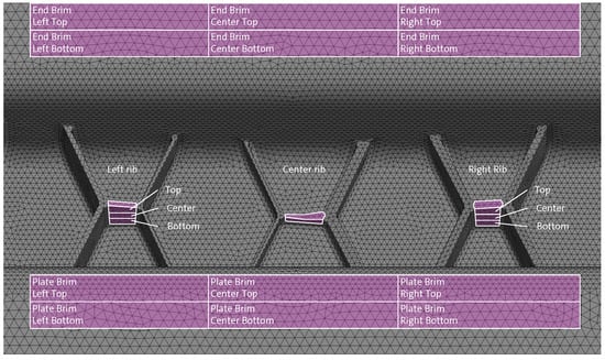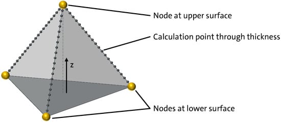 For polymer flows, the fundamental governing equations given above are non-linear, non-unique, complex, do not have a general solution, and are thus difficult to solve [108]. To gain analytical solutions and to reduce the required CPU time the balance equations must be simplified. 3D TIMON CompositePRESS avoids solving the Navier–Stokes equations to realize a 3D flow analysis of non-Newtonian polymer melts, and instead uses the traditional Hele-Shaw approximation for a 2.5D flow simulation (called Light 3D) conducted on a one layer tetra mesh when using the morphing method [109]. The Light 3D solver virtually divides each mesh element (tetra or hexa) into 20 calculation points across the thickness (between the nodes on the surfaces) in order to predict the flow front advancement realistically [109] (see Figure 2). This procedure allows the calculation of temperatures, velocities, shear rates, and viscosity changes through the thickness by using a single layer mesh [109]. The Light 3D method reduces the number of necessary elements for accurate flow predictions for large and thin parts drastically [109].