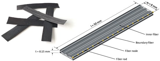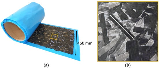 The high-performance CF-SMC used in this study is Hexcel’s HexMC® (Hexcel Corporation, Stamford, CT, USA). This DFC material is designed for compression molding of complex 3D shaped parts in a heated metal tool. HexMC consists of prepreg carbon/epoxy UD tapes that are longitudinally slit and transversely chopped into strands and then randomly distributed into a mat [14]. Those ROS have nominal in-plane dimensions of 50 × 8 mm and a thickness of approximately 0.15 mm (Figure 3). The strands contain high strength carbon fibers impregnated by fast-curing Hexcel HexPly® M77 epoxy resin [14,133]. The carbon fiber content amounts to 62% by weight in the raw material, corresponding to 57% fiber volume content in a molded part and giving a material density of 1.55 g/cm3 (Table 1) [14,15].