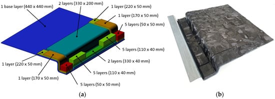 For the compression molding trial a research tool with a ribbed hat profile tool insert designed for compression molding of CF-SMCs is used (Figure 4a). The tool is made to mold a complex ribbed structure with ribs of varying heights and non-symmetrically alternating wall thicknesses with an attached plate (Figure 4b). The molded part has outer dimensions of 450 × 450 mm and a nominal wall thickness of 2 mm. The ribbed hat profile spans an area of 150 × 450 mm and has a hat height of 52 mm.