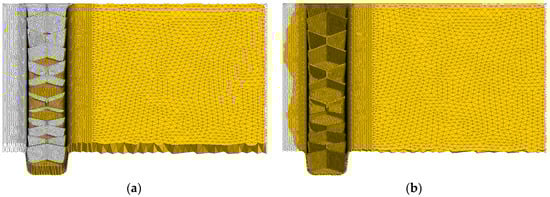 For a DFS of a small compression molded cross-rib-shaped SMC part in LS-DYNA (Livermore Software Technology Corporation (LSTC), Livermore, CA, USA) Hayashi et al. use beam elements constrained in highly deformable solid elements representing the matrix [101]. In order to enable large deformations of the matrix elements, the 3D adaptive Element-Free-Galerkin (EFG) method is applied. Recently, this tool was enhanced to handle ROS composites. The fibers within one strand are modeled by multiple connected elastic beam elements in a row [102]. Since the real amount of fibers in ROS composites and even within a strand is very large, the calculated number of fibers per strand was drastically reduced, while the beam thickness was increased to ensure maintaining the nominal fiber volume fraction of the material [102]. This simplification method reduces the numerical calculation time by representing thousands of fibers as fiber bundles. Considering microstructure studies reported in the literature [4,73,103,104], it can be seen that most of the fiber bundles or strands widen and flatten, but do not disperse. Only the highly sheared strands are more likely to fan out. This observation justifies the simplifying assumption to represent thousands of carbon fibers within a strand as one bundle in order to shorten the calculation time and to enable full component scale simulations [73].