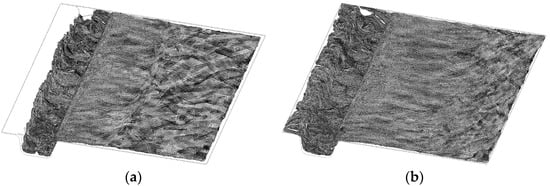 However, due to the part design together with the high fiber volume fraction and fiber length in the CF-SMC material, complex anisotropic material flow conditions occur [21], which induce a characteristic microstructure in compression molded components [5,31]. This process-induced microstructure is mainly characterized by locally varying fiber orientations and fiber concentrations. Besides defects such as voids (air entrapments), swirls or resin rich pockets in between strands [35,36,37,38,39,40], the flow-induced strand alignments have the biggest impact on the mechanical performance of DFC parts [21,31,41]. Therefore, obtaining realistic 3D information of the local strand orientations in a CF-SMC part is key for a better understanding of its related mechanical behavior and a sophisticated part design. 3D representations of the morphology of entire CF-SMC parts help engineers to grasp the compression molding process related fiber alignment and the gained fiber orientation information can be mapped to a structural simulation mesh and used as a digital twin in an integrative (coupled) Finite Element Analysis (FEA) [42,43]. This microstructure information can be acquired by precise and reliable process simulations or laborious micro-computed tomography (µCT) measurements. CT scans that allow fiber orientation measurements of complete parts may be used to compare ‘real’ with numerically predicted fiber orientations coming from molding simulations in order to evaluate the quality of the simulation results. However, especially for parts made of carbon fiber reinforced plastics, this is so far a costly challenge due to the low contrast between the carbon fibers and the polymer matrix system in CT scans.