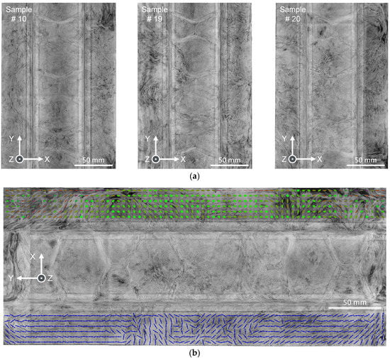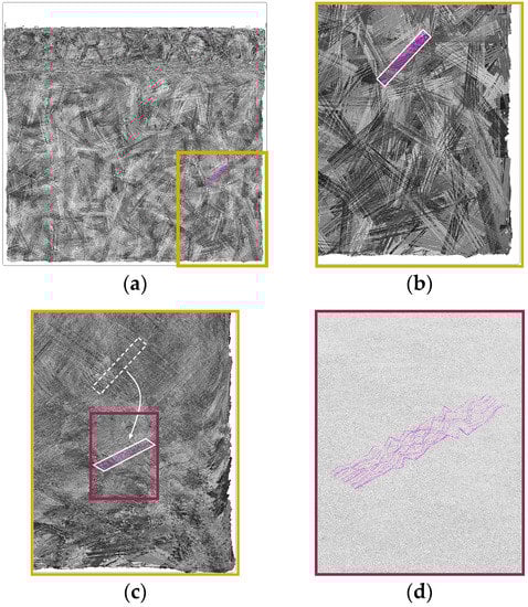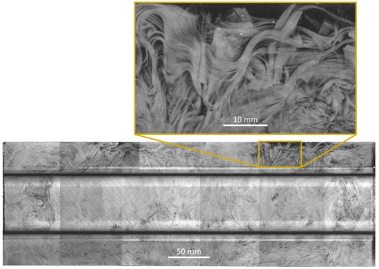 Denos et al. use a CT scan with a mesoscale resolution of 53 µm (voxel edge length) to determine the heterogeneous internal microstructure of a prepreg carbon/polyetherketoneketone (PEKK) UD strand-based T-bracket part with maximum dimensions of 65 × 65 × 45 mm [20,42,43]. However, at that resolution and with the applied CT scan settings it is not possible to distinguish between single carbon fibers (⌀ ≈ 5–7 µm) and the matrix or to discern strand boundaries (~100 µm thick) in thickness direction [42]. Although Denos’ CT scan configuration is not able to represent distinct strand boundaries, it is still possible to receive a mean local fiber orientation due to sufficiently pronounced relative density gradients [20,42].