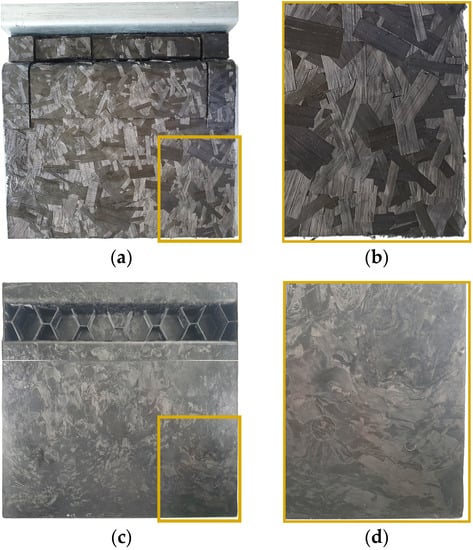 The low tooling costs (compared to steel processing) and fast cycle times make compression molding a cost-efficient method to manufacture large DFC parts in a one-shot high volume production process, enabling DFC parts to replace automotive metal components for mass-reduction purposes [6,7]. As this material class and manufacturing method allow a high freedom of design [5], part integration (e.g., fasteners or inserts) [7], and can be used to mold complex three-dimensional (3D) shaped structural and non-structural components with corrugations, ribs and domes, it is widely used among the automotive industry and a key aspect for the endeavor to reduce the vehicle weight as much as possible [5,8]. Among this type of DFC, carbon fiber sheet molding compounds (CF-SMC) have been extensively used for interior and exterior, structural and non-structural composite applications in the automotive and aerospace industry [7,9,10,11,12].