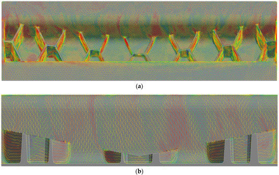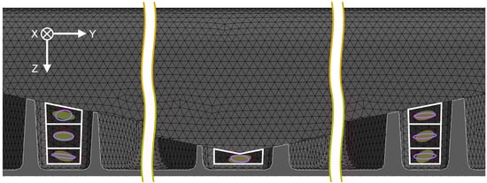 Recently, Meyer et al. [73] presented a DBS method that reproduces Jeffery’s equation for single fiber bundles in shear flow, which are described as a chain of truss elements. Since the bundles are represented as one-dimensional instances, they can move independently from the matrix material, flow and interact through contact forces and with hydrodynamic drag forces of the surrounding flow. Since bundle–wall and bundle–bundle interactions are considered, there is no need for empirical interaction parameters, unlike in the commonly used statistical descriptors of fiber orientation changes (Folgar–Tucker-based models). Since this DBS approach additionally considers two-way coupling it allows for a more accurate calculation of fiber volume fraction distributions, knit lines and FMS at a component level with reasonable computation times [73].