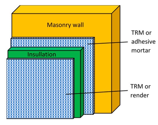 In addition to seismic retrofitting, there is a strong need for effective solutions for the energy retrofitting of the building envelope; this is attributed to the vast energy consumption associated with the old building stock, and hence to the high environmental impact of old buildings. TRM jacketing has minimal, if any, thermal insulation capacity, while external or internal insulation has no load bearing capacity. In this study, we propose the integration of the two systems into a single unit, which provides both energy and seismic upgrading. In this integrated system (Figure 1), the insulating material is combined with the TRM as a single unit, which may be either constructed in situ or in the form of a prefabricated board. Depending on the constructability requirements and the aesthetics, the system may be placed either on one side of existing masonry walls or on both [7]. The TRM may be placed between the insulation and the masonry wall or outside the insulating material. These concepts are investigated experimentally, analytically, and numerically in the present study, for the case of masonry walls subjected to out-of-plane cyclic loading. More details on the experimental part for the case of out-of-plane loading, and also related to in-plane loading, are given in [8,9]. The experimental results are found in good agreement with analytical modeling as well as finite element modeling; both modeling approaches may be used in future studies to perform detailed parametric analyses. Further studies on the proposed technique are reported in [10,11].