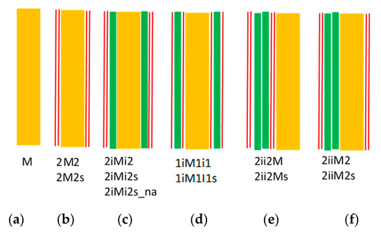 Cross section of specimens for out-of-plane loading: (a) M; (b) 2M2 or 2M2s; (c) 2iMi2 or 2iMi2s or 2iMi2s_na; (d) 1i1M1i1 or 1i1M1i1s; (e) 1ii1M or 2ii2Ms; and (f) 2iiM2 or 2iiM2s.