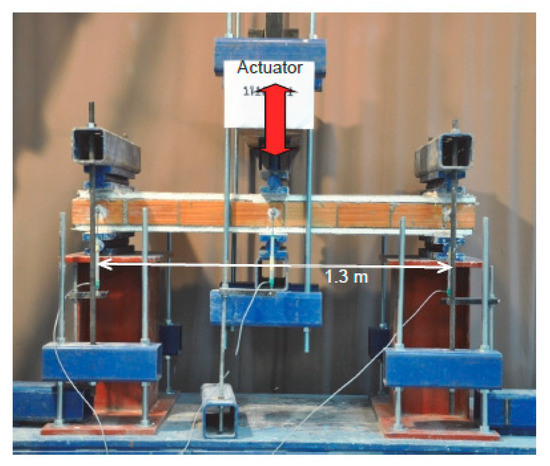 All specimens were subjected to cyclic out-of-plane loading using a stiff steel frame. The walls were laid horizontal and were loaded in three-point bending at a span of 1.30 m (Figure 3). Two pairs of steel hinges were placed at each support (along the specimens’ width, at top and bottom), and a third pair was placed at mid-span, along the load application line.