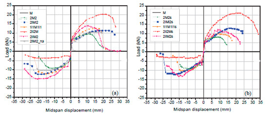 The load versus displacement envelope curves of the hysteresis loops for specimens are given in Figure 4. Typical photographs of failure mechanisms are given in Figure 5. Peak load values in the push and pull directions, mid-span displacements at failure, cumulative energy dissipation capacity, and observed failure modes are given in Table 1, for all specimens. Failure was defined at the point of the load versus mid-span displacement envelope curve where a 20% reduction in load was recorded.