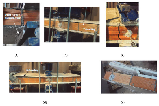 At the beam level, bond failure may occur at different TRM–insulation–masonry interfaces. Two debonding mechanisms were observed in the experimental study (Figure 10): (a) end debonding and (b) intermediate crack debonding.