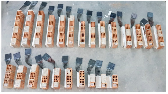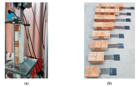 For the investigation of bond-related failure modes, bond–slip tests were carried out, according to the setup described in [12]. Masonry specimens were constructed using the same (as described above) 12-hole, horizontally perforated clay bricks and a general-purpose masonry cement mortar covered with EPS insulation and TRM reinforcement on the outer surface (Figure 6a). A total of 8 different bond lengths of the reinforcement insulation were tested (Figure 6b). The specimens had lengths of 150, 190, 255, 300, 355, 410, 520, and 640 mm, with common width for all specimens equal to 85 mm. The thickness of masonry, insulation material, and TRM was equal to 85, 20, and 10 mm, respectively.