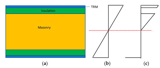 This type of failure occurs when the compression strength of the brick or TRM layer is reached or when the tension strength of the TRM is reached. The moment of resistance of the mid-span section of each specimen is calculated using classical bending theory considering linear strain distribution and force equilibrium. This theory assumes the plane section and neglects shear deformations. An example of cross-section strain and stress profiles analysis is given in Figure 9 (the location of the neutral axis is indicative, at an arbitrary depth).