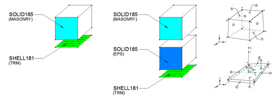 Standard SOLID185 brick elements of the ANSYS element library were used to simulate the masonry walls and the insulation panels, while SHELL181 shell elements were used for the TRM matrix. The elements arrangement and the geometry of the models for each case are presented in Figure 11 and Figure 12.