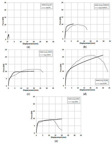 Force–displacement envelope curves for the experimental versus numerical results: (a) specimen M, (b), specimen 1i1M1i1, (c) specimen 2iMi2, (d) specimen 2ii2M, (e) specimen 2M2.