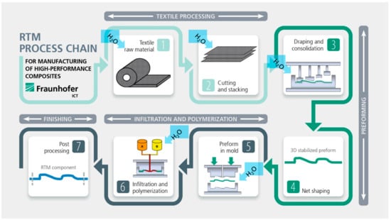 High damage tolerance, good fatigue behavior, the possibility of functionalization, weldability and the recyclability of the components are the particular advantages of thermoplastic fiber composites (TPCs) compared to their thermoset counterparts [1,2]. Even though thermoset matrices currently represent the majority of the FRPs market [3,4], these composites cannot be melted or formed after manufacture due to the cross-linkage. The possibilities for recycling are therefore very limited. The production of thermoplastic composite materials in, for example, the thermoplastic RTM process, enables the possibility for recycling, which is a great advantage with regard to environmental issues [5,6].