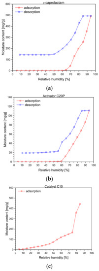 Sorption isotherms at 23 °C of (a) ε-caprolactam, (b) activator BRUGGOLEN® C20P and (c) catalyst BRUGGOLEN® C10.
