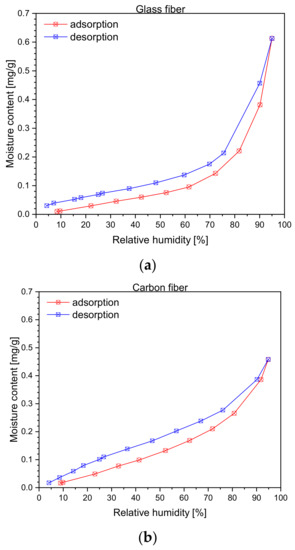 The sorption isotherms of glass fibers type 92125 FK800 at 23 °C are shown in Figure 3a. The moisture load in the glass fibers starts at a RH of 10% and increases exponentially with increasing RH. The fibers have a significantly lower total moisture load compared to the matrix components. The maximum moisture load near the saturation vapor pressure is 0.62 mg/g. The moisture release of the glass fibers takes place directly when the saturation vapor pressure is undershot, i.e., no plateau is formed between adsorption and desorption. The desorption behaves similar to the adsorption. An almost complete release of the moisture load can be seen. Figure 3b shows the moisture content of carbon fibers in relation with RH. The carbon fibers also have a comparatively low moisture load. The moisture uptake starts at a relative humidity of 10% and behaves almost linearly up to 70%. The maximum value of moisture loading near the saturation vapor pressure is 0.48 mg/g. The desorption curve of the carbon fiber is nearly similar to the adsorption curve. The moisture load decreases to almost 0%.