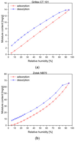 In Figure 4a the sorption isotherm of the binder powder is shown. The moisture load of the binder powder increases almost linearly with the relative humidity. The maximum load is 14 mg/g. The binder powder exhibits a clearly visible hysteresis loop in the desorption behavior. The upper part of the loop has only a minimal horizontal area, which indicates pores without a narrow opening and therefore only a slight drop in vapor pressure. Furthermore, the hysteresis loop is not closed at the lower end, which indicates that some of the moisture is not completely desorbed or is bound to the material in a different way than adsorption.