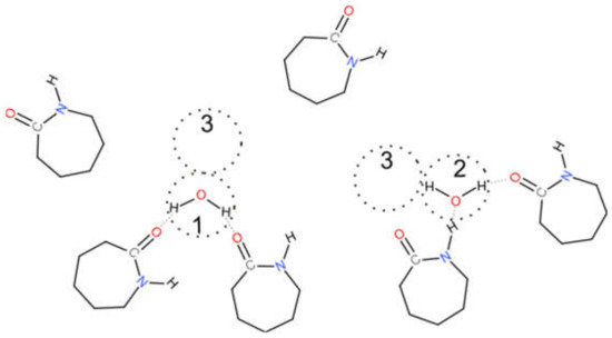 In the case of ε-caprolactam, hydrolytic polymerization with water at room temperature is very unlikely. However, adjacent amide groups can form sorption centers [19]. There are three ways, water molecules may interact with the sorption centers, see Figure 5. A water molecule can form hydrogen bonds with two carbonyl groups of the caprolactam molecules. This water is difficult to dissolve from this bond because of these two hydrogen bonds. A water molecule can also form a hydrogen bond to a carbonyl and an amide group. The third possibility is that the water molecule is bound by capillary condensation [20].