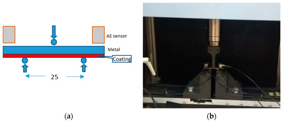In order to generate cracks in the coatings, the three-point flexural test, one of the methods most collected in the literature for this purpose, was performed [12,14,15], with a configuration like the one presented in Figure 1a,b.
