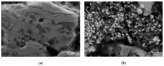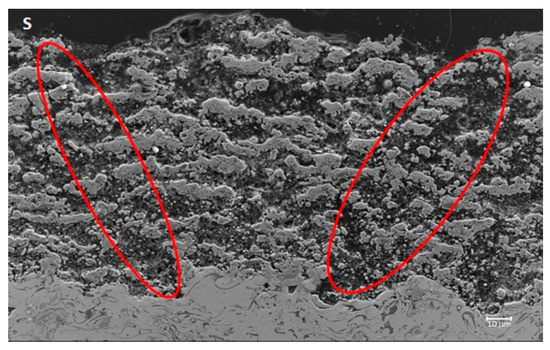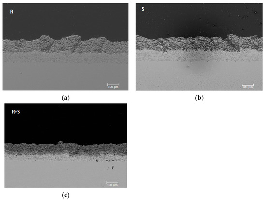 The R series, a Y-TZP/Al2O3 coating, as seen in Figure 2a; the S series, a Al2O3 + 15 wt.% SiC in Figure 2b; and a bilayered R + S series, composed of a R series coat between the anchor layer and the external one, and an external coat like the S series in Figure 2c, generally show a laminar structure formed by molten splats and unfused particles, as is usual in SPS and SPPS coatings [6,8,17]. In addition, the unfused areas have an elongated shape and are located between the molten splats, forming an intercalated structure.