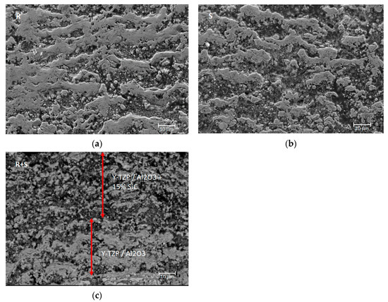 In the case of the S series (Y-TZP/Al2O3 + 15% SiC) in Figure 3b, the molten lamellar zones vary from 4 to 10 μm, and the unfused zone from 3 to 30 μm. In the case of R + S series in Figure 3c, the zone corresponding to a Y-TZP/Al2O3 is just the same as R series; however, in the case of the layer corresponding to Y-TZP/Al2O3 + 15% SiC, the molten zones are from 2 to 6 μm and less lamellar like microstructures, so the addition of SiC seems to generate more discrete fused zones than ones obtained in the Y-TZP/Al2O3 layer.