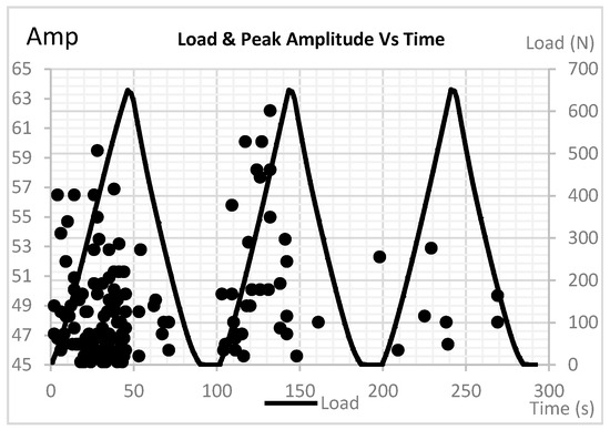 Remarkable AE events were generated during the discharge, due to an identified pattern of frequencies associated with Mode I and II cracks, an event that Eleni et al. [18] attributed to the separation and sliding of the reinforcement in their material. In this case, it may be due to a rearrangement of fractured surfaces because the delamination processes are not yet present.